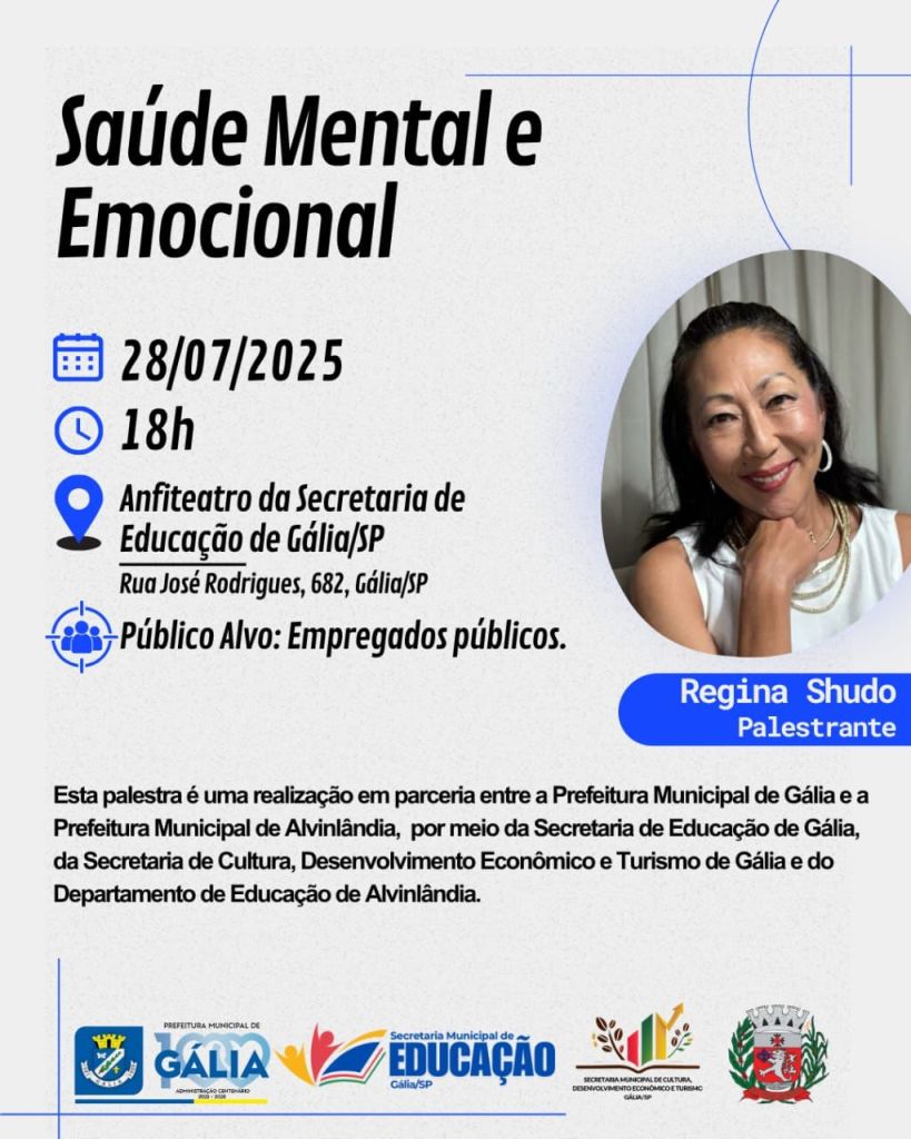 Palestra realizada em parceria entre a Prefeitura Municipal de Gália e a Prefeitura municipal de Alvinlândia por meio das Secretarias de Educação, Cultura, Desenvolvimento Econômico e Turismo de Gália e da Secretaria de Educação de Alvinlândia.